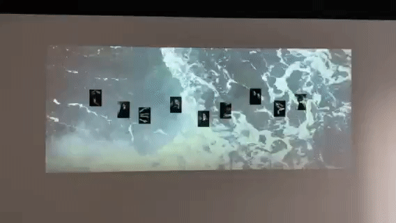 The work of art is called Bodies of Water. He described it as a pun with the pictures containing bodies in the ocean water. The pictures of people are floating encased in the ocean waves. The ocean wave video came with a story where he was on a rock and he almost fell into the ocean trying to get the right image he wanted. John was trying to explore calmness, life, and trying to show his passion for videography and photos. He said that his work correlates with whatever life event is occurring at the time. The water is his experiences of life currently where his close friends were moving away across the ocean. He also wanted to symbolize his connection with the ocean because of his father.