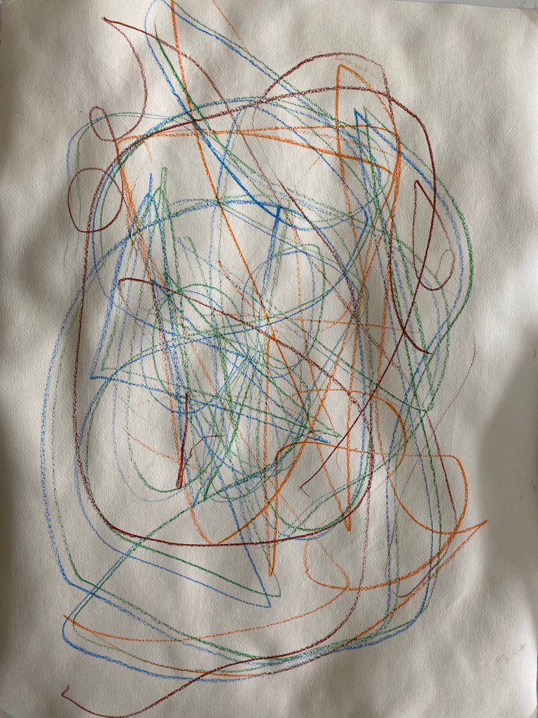 The automatic drawing was interesting. I used the backside of my finger painting drawing as the canvas. I got my whiteboard and taped the painting to it. My girlfriend wanted to use multiple colors so we chose four different colors. We kind of “fought” for the direction of where the crayon went but overall it was a different experience. I think our drawing came out well for having our eyes closed and just letting the crayon draw. If we only used one color then I think it would not have came out that well so it was a good idea to use multiple colors. For each color, we reset and let the crayon draw over and over.